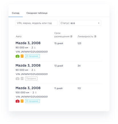 Список авто в продажедля оперативного анализа